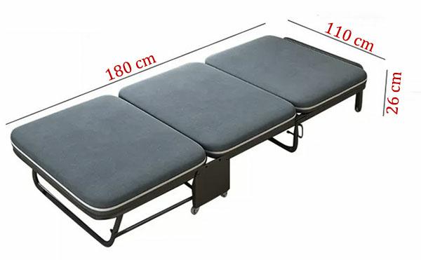Giường Xếp Gấp 3 Nakawa NK-110 là dòng giường xếp gấp 3 có kích thước lớn nhất trong dòng gấp 3 Nakawa. Giường NK-110 có kích thước lên tới 1.1m rất rộng rãi và thoải mái đặc biết là những người có thân hình quá khổ. Giường gấp Nakawa NK-110 có thiết kế vô cùng chắc chắn khung giường bằng thép sơn tĩnh điện màu đen rất sang trọng, đệm của giường làm từ mút bọt biển và bong ép đọ dày lên tới 7cm mang lại cảm giác êm ái và thoáng mát khi sử dụng.